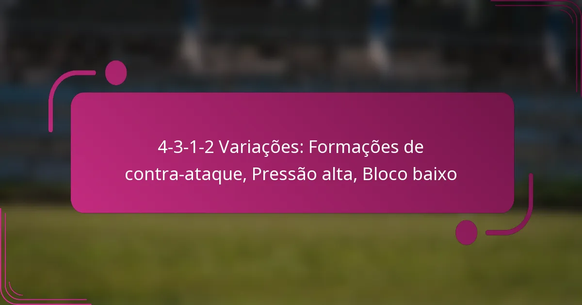 A formação 4-3-1-2 é uma configuração tática no futebol que apresenta quatro defensores, três médios, um médio ofensivo e dois avançados. Esta formação não só enfatiza uma forte presença no meio-campo, mas também permite adaptabilidade em várias estratégias, como formações de contra-ataque, pressão alta e bloqueio baixo. Cada variação aproveita as forças inerentes da formação para explorar as fraquezas do adversário e melhorar o desempenho geral da equipa.